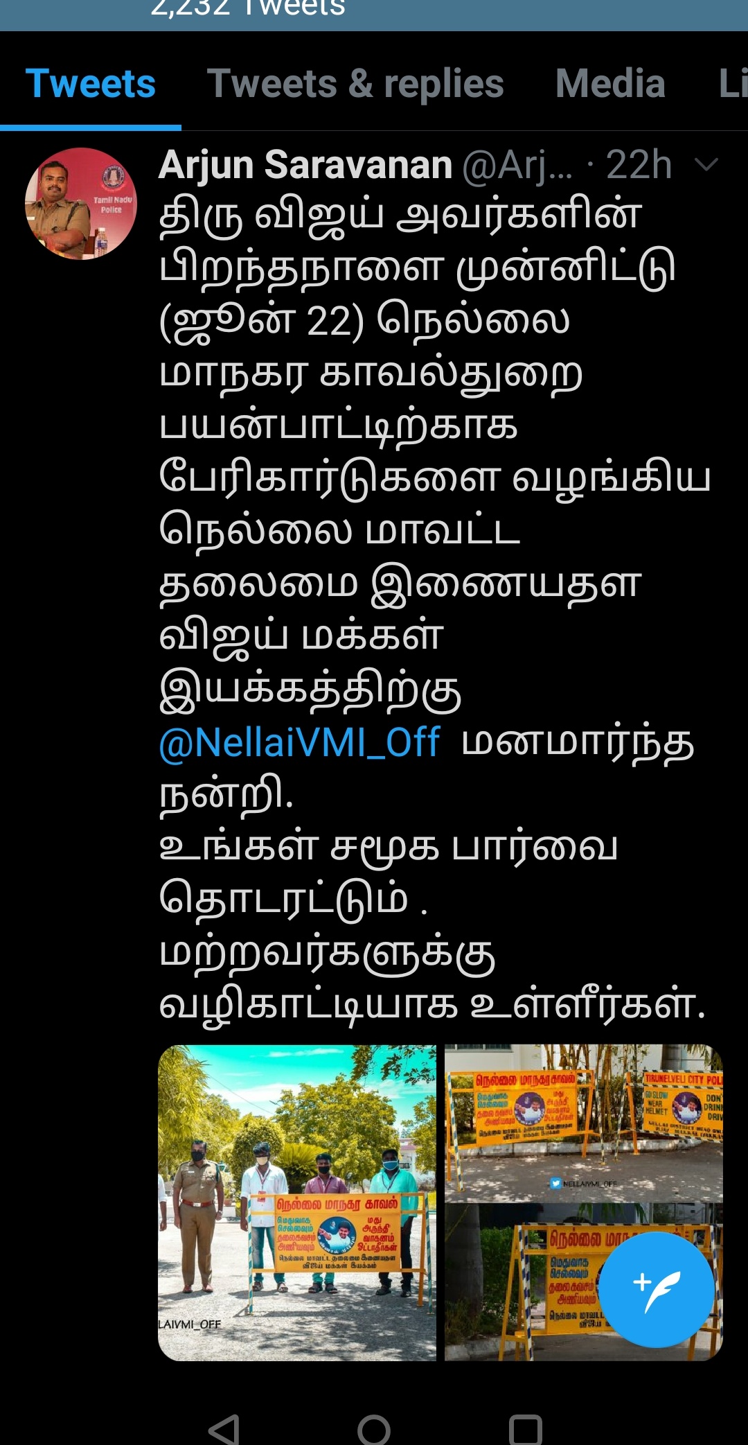 இதற்கு நன்றி தெரிவித்து ட்வீட் செய்திருக்கும் திருநெல்வேலி நகர காவல்துறை துணை ஆணையர் அர்ஜுன் சரவணன், “விஜய் பிறந்தநாளை முன்னிட்டு (ஜூன் 22) நெல்லை மாநகர காவல்துறை பயன்பாட்டிற்காக பேரிகார்டுகளை வழங்கிய நெல்லை மாவட்ட தலைமை இணையதள விஜய் மக்கள் இயக்கத்திற்கு மனமார்ந்த நன்றி. உங்கள் சமூக பார்வை தொடரட்டும் . மற்றவர்களுக்கு வழிகாட்டியாக உள்ளீர்கள்” என்று கூறியுள்ளார்.