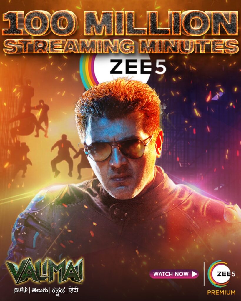 Valimai, Blockbuster action entertainer of 2022 was released on Zee5 yesterday. It got the biggest opening ever with 100 million streaming minutes.