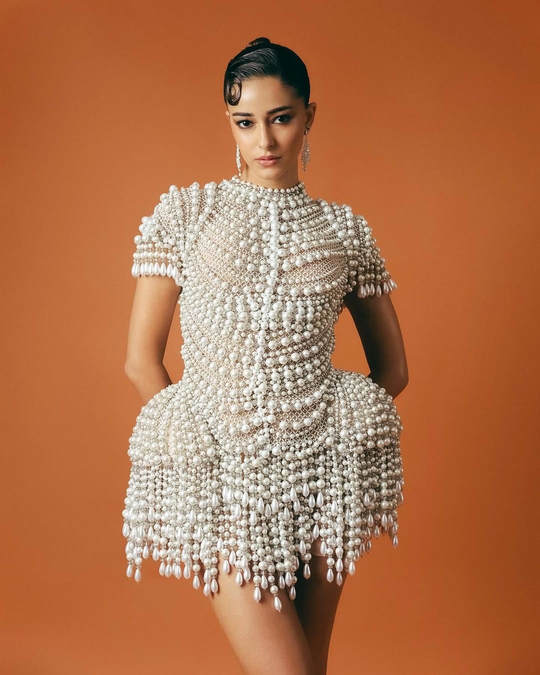 *Ananya Panday:* Ananya Panday brought urban radiance and a bold silhouette in a white, structured outfit boasting pearl elements all across, alongwith pulled-up detail around the waistline. The actress styled her hair in a sleek bun and accessorised her look with pearl jewellery – drop earrings and a stacked bracelet.