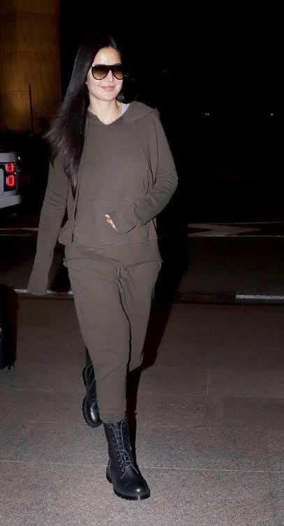 Katrina Kaif makes airport style look easy by pairing a comfy co-ord set with black lace-up boots practical yet effortlessly chic.