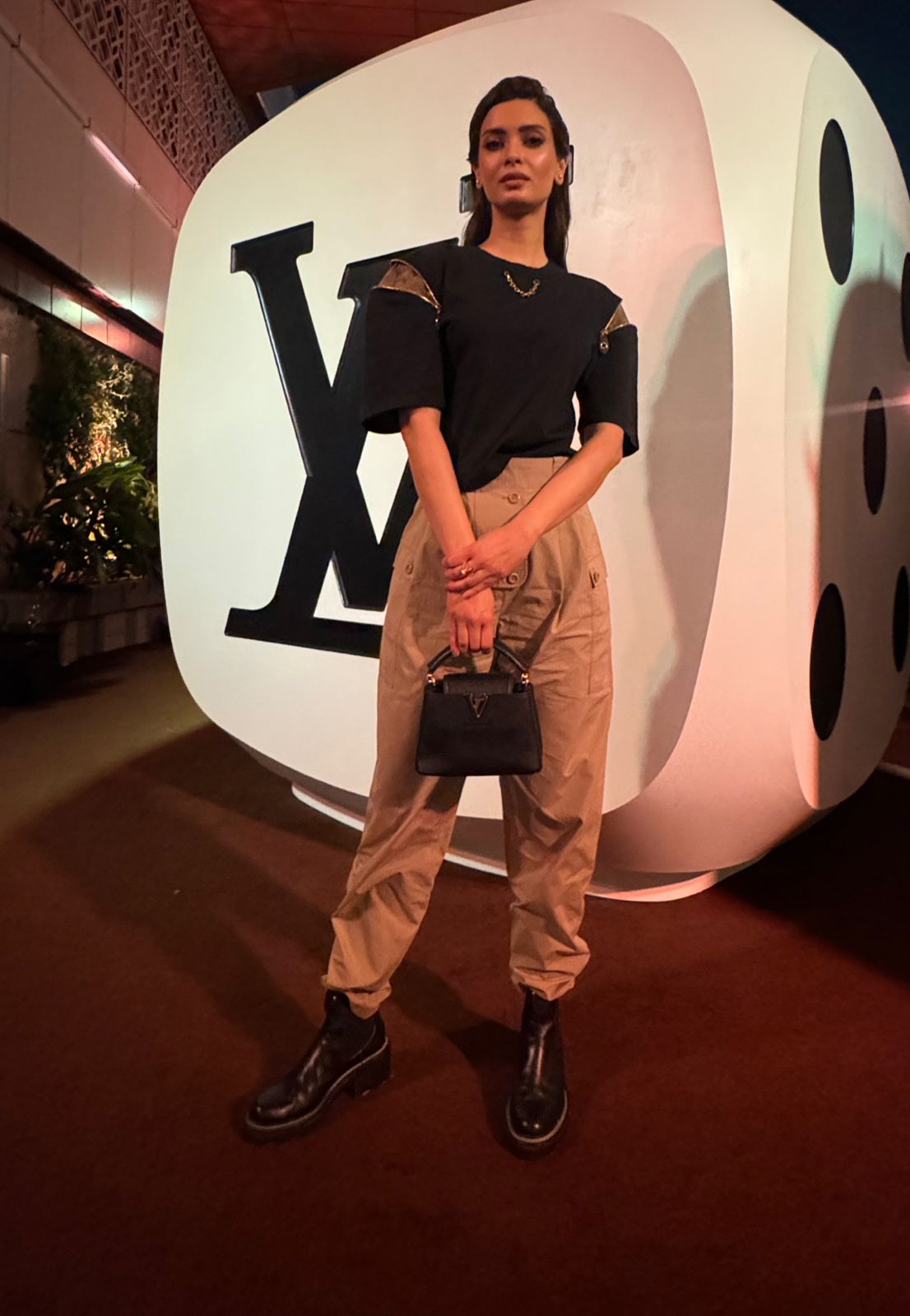 Diana Penty keeps it effortlessly cool by pairing classic LV boots with matching LV pants. Styled with sleek black hair, her urban-chic look is minimal, sharp, and undeniably stylish.
