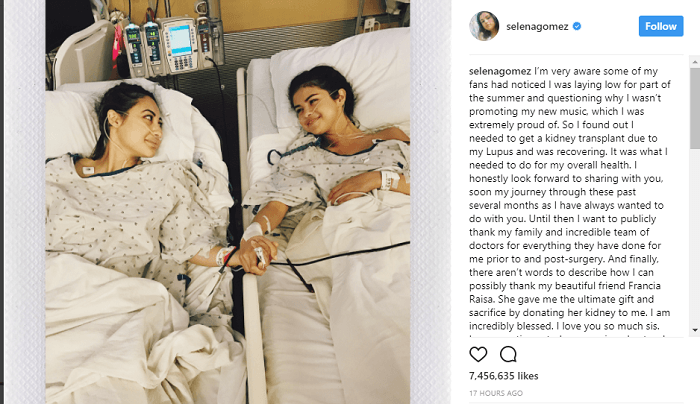 அந்த அளவிற்கு புகழ் பெற்ற இவருக்கு கிட்னியில் பிரச்சனை ஏற்பட்டு சமீபத்தில் மாற்று அறுவை சிகிச்சை செய்து கொண்டார், இவருக்கு நெருங்கிய தோழியும் முன்னணி நடிகையுமான Francia Raisa கிட்னி கொடுத்து உதவி உள்ளார்.