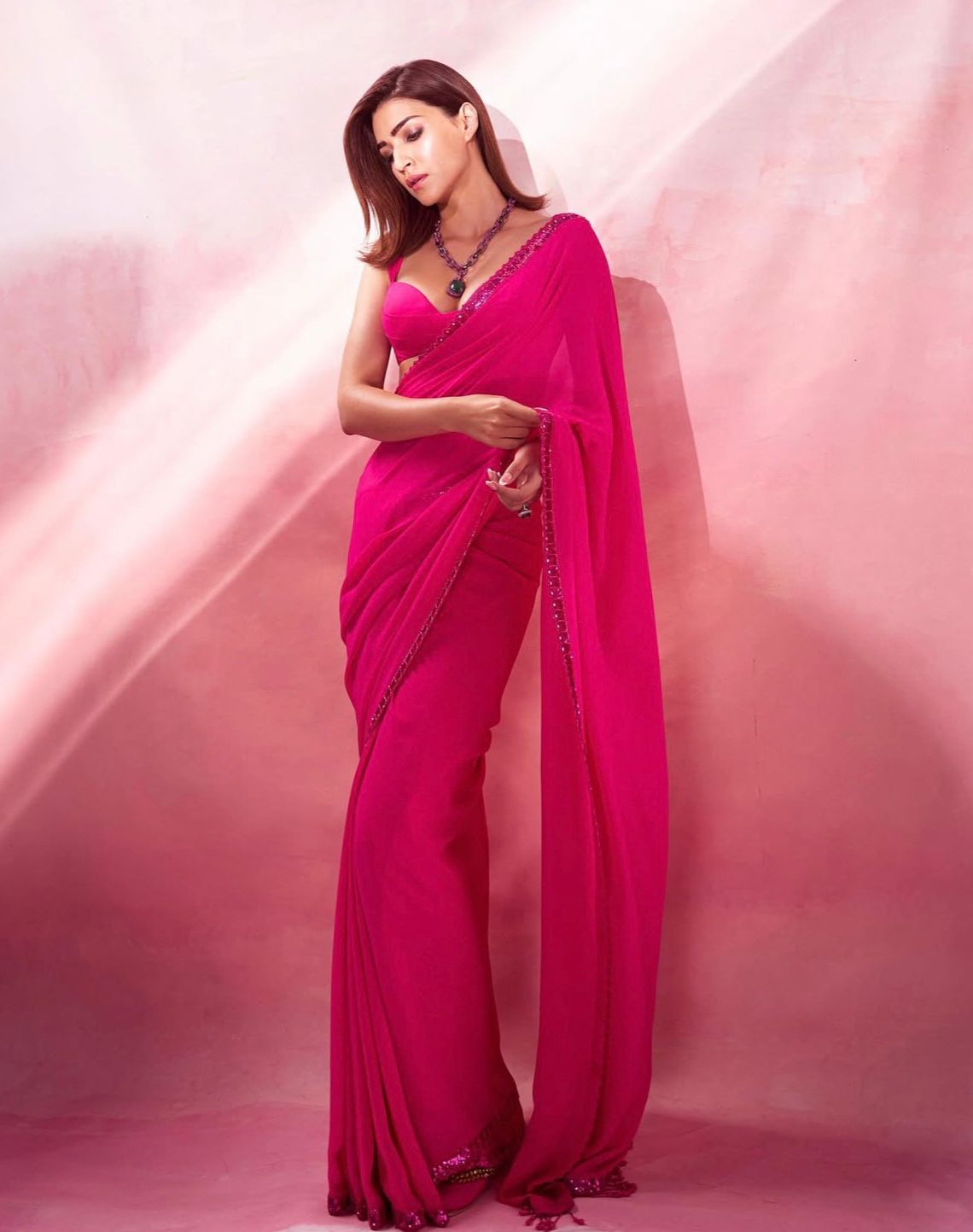 *Kriti Sanon:* Kriti Sanon sets the glam quotient high by donning a bright pink saree with a thin border. Letting the drape speak volumes, she simply accessorises with a showstopping chained neckpiece, adding gravitas to her appearance.