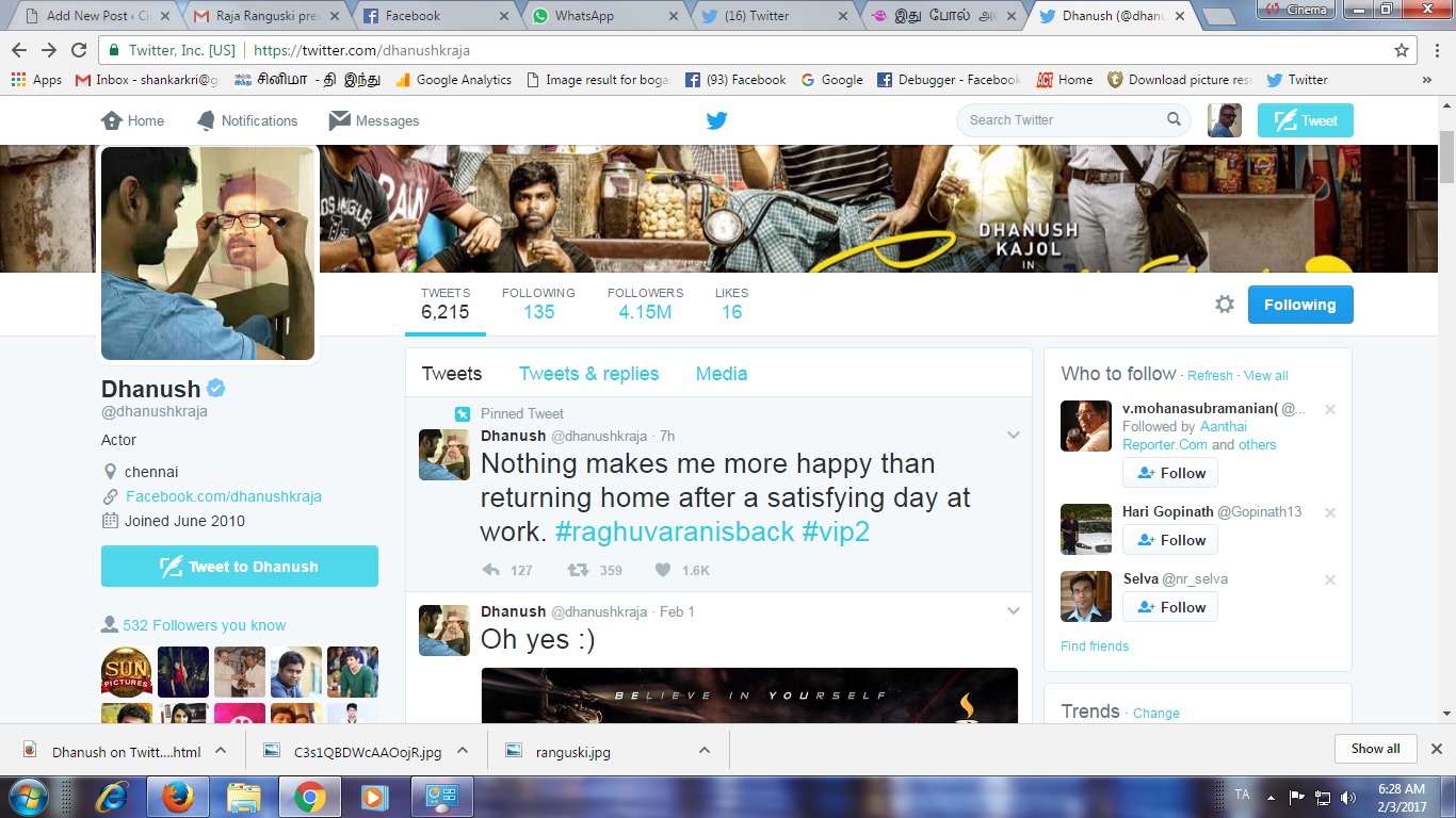 நடிகர் தனுஷ் தற்போது வி ஐ பி 2 படத்தில் நடித்து வருகிறார். பொதுவாகவே ட்விட்டரில் அதிகம் ஆக்ட்டிவாக இருக்கும் நடிகர்களில் ஒருவர், தனது படங்களை பற்றியும் சக ஹீரோக்கு வாழ்த்து சொல்வதை போன்ற பல நல்ல விஷயங்களை ட்விட்டரின் மூலம் தெரிவிப்பார்.