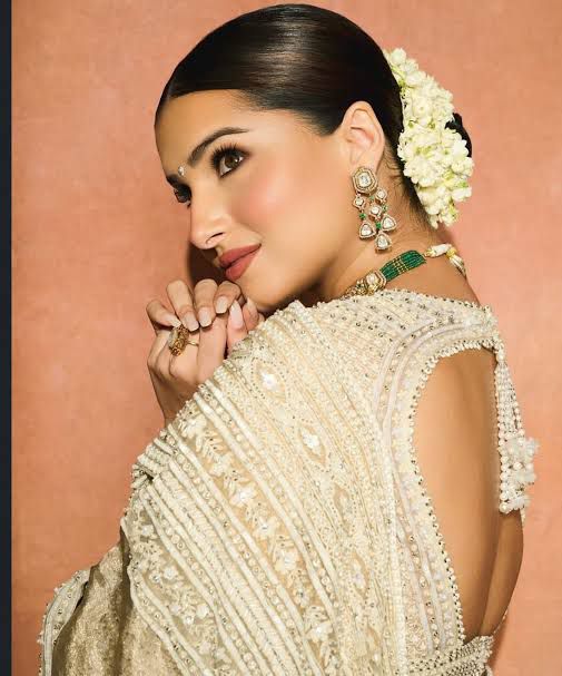 *Tara Sutaria:* Tara Sutaria keeps it neat with a sleek bun, which she adorns with fresh gajras. The actress opts for sophisticated accessories by opting a choker and drop earrings.