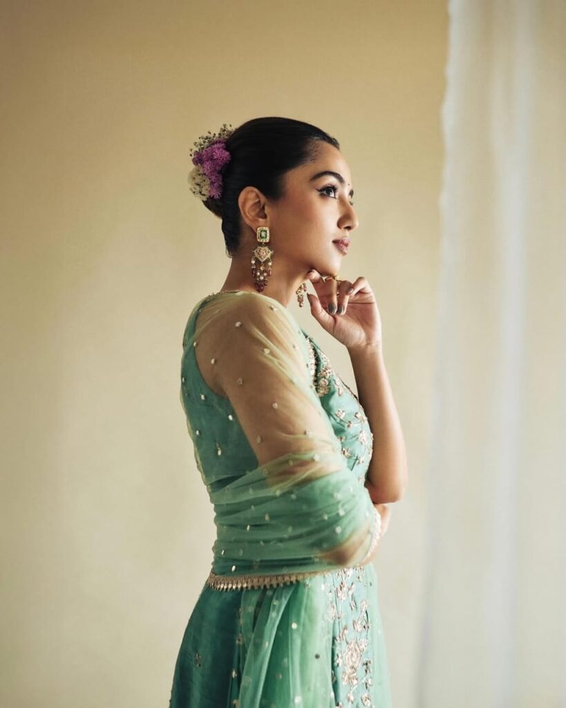 *Ahsaas Channa* : If you’re someone who loves to add a playful pop of colour to your festive looks, Ahsaas Channa’s hairstyle is the one to bookmark! She keeps it fun by tying her hair in a simple ponytail and decking it up with multicoloured floral accessories that mimic a garba “gun chakkar” vibe. This quirky twist not only amps up the festive energy but also ensures your hair looks vibrant while you groove through the night.