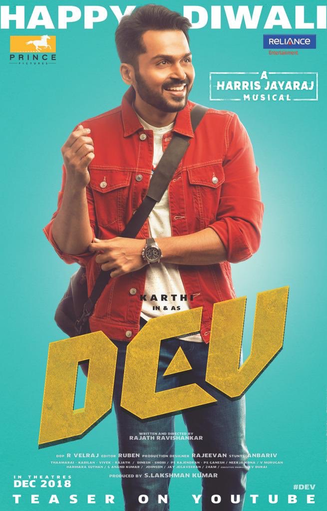 வரும் டிசம்பர் மாதம் வெளியாகவிருக்கும் இப்படத்தில் நடிகர் கார்த்திக்கு ஜோடியாக நடிகை ரகுல் ப்ரீத் சிங் நடிக்கிறார். மேலும் பிரகாஷ் ராஜ், ரம்யா கிருஷ்ணன் போன்ற நடிகர்கள் தேவ் படத்தில் முக்கிய பாத்திரத்தில் உள்ளனர்.