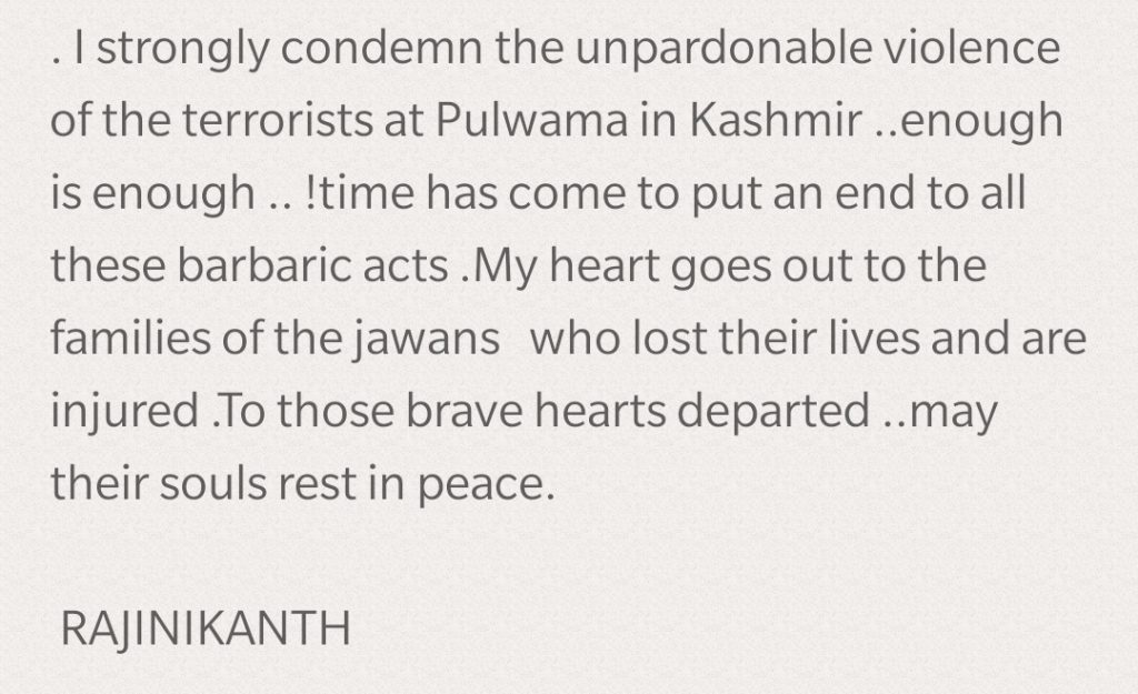 காஷ்மீர் புல்வாமாவில் நேற்று முன் தினம் தீவிரவாதிகள் நடத்திய வன்முறை தாக்குதலில் கிட்டதட்ட்ட நாற்பதுக்கும் மேல் வீரர்கள் பலியானார்கள் இதற்க்கு பலரும் வன்மையான எதிர்ப்பை தெரிவித்து வருகின்றனர் அந்த வகையில் சூப்பர் ஸ்டார் ரஜினிகாந்த் நான் வன்மையாக கண்டிக்கிறேன். பொறுத்தது போதும்… என்று மிகவும் ஆவேசத்துடன் தன் எதிர்ப்பை ட்விட்டர் மூலம் தெரிவித்துள்ளார்