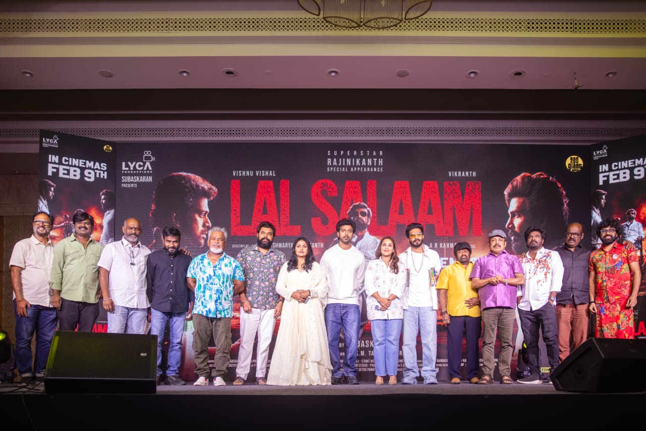 பிரம்மாண்ட தயாரிப்பு நிறுவனமான லைகா புரொடக்ஷன்ஸ் திரு.சுபாஸ்கரன் மற்றும் தலைமை நிர்வாகி ஜி.கே.எம்.தமிழ்க்குமரன் ஆகியோரின் தயாரிப்பில் ‘சூப்பர் ஸ்டார்’ திரு.ரஜினிகாந்த் அவர்கள் சிறப்பு தோற்றத்தில் நடிக்க, விஷ்ணு விஷால் மற்றும் விக்ராந்த் இவர்கள் நடிப்பில் ரஜினிகாந்த் அவர்களின் மகளும் இயக்குனருமான திரு.ஐஸ்வர்யா ரஜினிகாந்த் அவர்களின் திரைக்கதை மற்றும் இயக்கத்தில் ‘இசைப்புயல்’ ஏ.ஆர்.ரஹ்மான் அவர்களின் இசையில் லால் சலாம் படம் வரும் பிப்ரவரி 9-ஆம் தேதி வெளியாக உள்ளது. அதை ஒட்டி திரைப்படக் குழுவினரின் பத்திரிகையாளர் சந்திப்பு நேற்று ஒரு தனியார் ஹோட்டலில் நடைபெற்றது.
