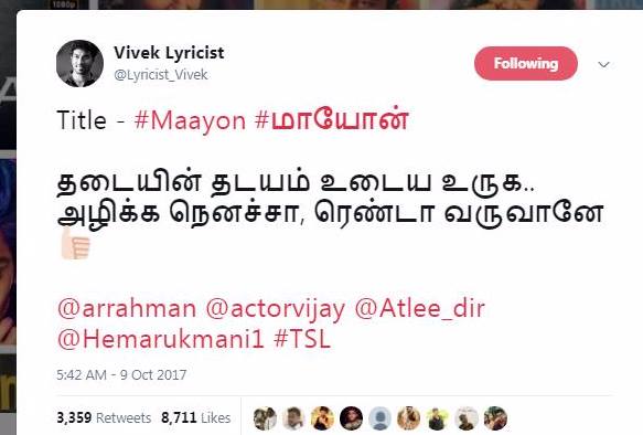 என்று இந்த பாடல் தொடங்குவதாக விவேக் தனது சமூக வலைத்தளத்தில் பதிவு செய்துள்ளார்.