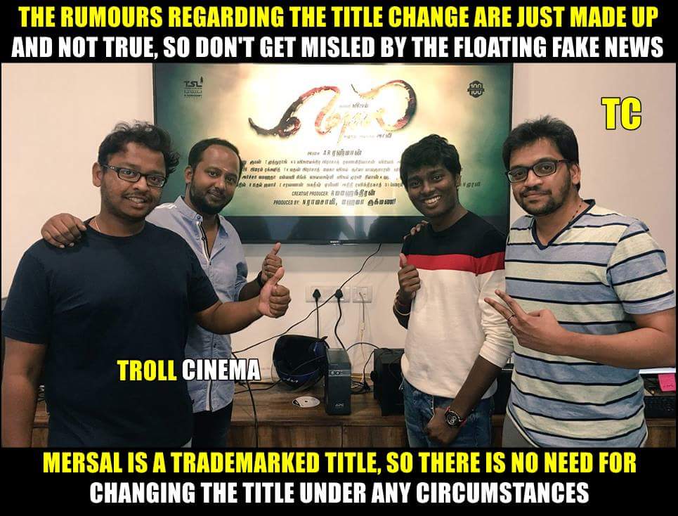 இவை அனைத்தும் ஒரு பக்கம் இருக்க படத்துக்கு athavathu படத்தின் டைட்டில்க்கு ஒரு சோதனை வந்தது இந்த படத்தின் டைட்டில் என்னுடையது என்று இதனால் ரசிகர்கள் கொஞ்சம் மனம் உடைந்தனர். ஆனால் அவர்களுக்கு சந்தோஷ செய்தி அதாவது மெர்சல் டைட்டில் தான் படத்தி பெயர் இதில் எந்த மாற்றமும் இல்லை என்று இயக்குனர் அட்லி அதிகார்பபூர்வமாக அறிவித்துள்ளார் அது மட்டும் இல்லாமல் இந்த டைட்டிலுக்கு ட்ரேட் மார்க் வாங்கிவிட்டார்கள் அதனால் இதை பற்றி தவறான செய்திகளை நம்ப வேண்டாம் என்று இயக்குனர் அட்லி தெரிவித்துள்ளார் .