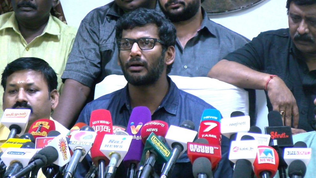 செய்தியாளர்களிடம் விஷால் பேசியது :- தயாரிப்பாளர் சங்க வேலை நிறுத்தத்திற்கு ஒத்துழைப்பு க் கொடுத்த FEFSI தொழிலாளர்களுக்கு கடமைப்பட்டுள்ளோம். தமிழ் திரைத்துறை ஜூன் மாதம் முதல் முழுமையாக கணினிமயமக்கபடும் இனி முழு வெளிப்படைத்தன்மையோடு இருக்கும். தயாரிப்பாளர் சங்கமே டிக்கெட் விற்பனை இணையதளத்தை தொடங்கும். அதற்கான பணிகள் தொடங்கப்பட்டுள்ளன.அரசு நிர்ணயம் செய்துள்ள அதிகப்பட்ச டிக்கெட் விலைக்கு மேல் எங்கும் விற்கப்படாது. அது கண்காணிக்கப்படும். அதை கண்காணிக்க ஒரு குழு அமைக்கப்பட்டுள்ளது . தமிழ் சினிமா வெளியீட்டை முறைப்படுத்த ஒரு குழு அமைத்து, அதன்மூலம் பட்டியலிட இருக்கிறோம். கடந்த 16 ஆம் தேதி முதல் நிறுத்தி வைக்கப்பட்டிருந்த படபிடிப்புகள் வெள்ளிக்கிழமை முதல் தொடங்கும். சம்பளம் தொடர்பாக நடிகர்களுடன் பேச வருகிற சனிக்கிழமை எல்லா நடிகர்களையும் சந்திக்கிறோம். சம்பள விவகாரம் குறித்து அதற்கு பின்னர் தெரிவிக்கப்படும்.காலா படம் வெளியீடு தள்ளிப்போகிறது. தனுஷ் மற்றும் வுண்டர்பார் நிறுவனத்திருக்கு நன்றி. அவர்களின் ஓத்துழைப்பு மிகப்பெரியது.