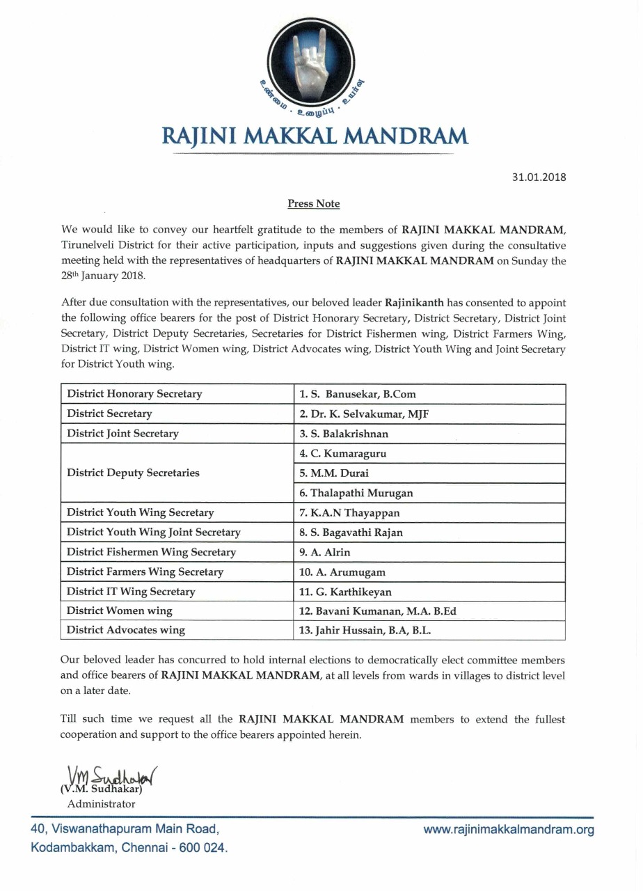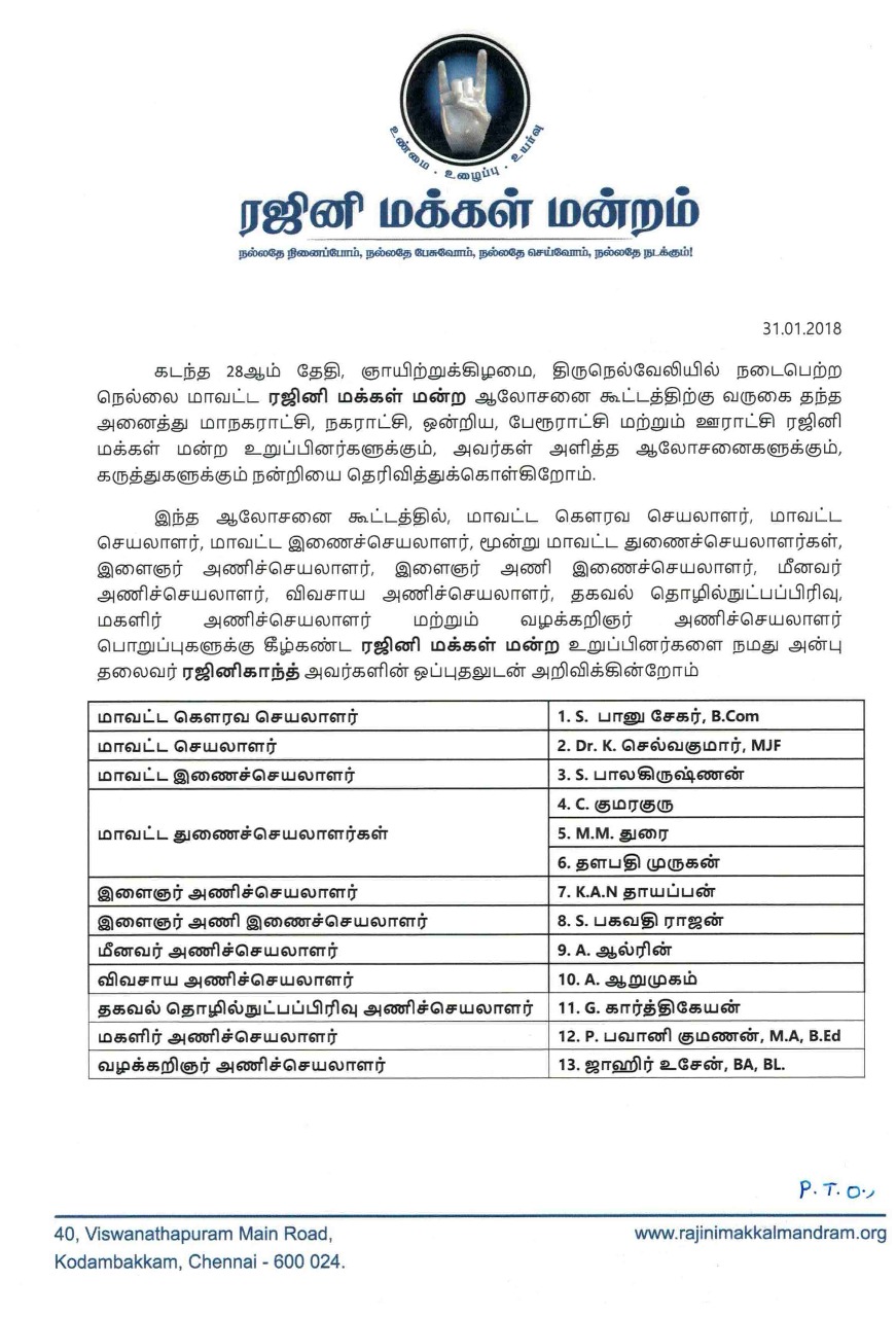 திருநெல்வேலி: திருநெல்வேலி மாவட்டத்தில் ரஜினி மக்கள் மன்ற அதிகாரப்பூர்வ நிர்வாகிகளின் பட்டியல் வெளியிடப்பட்டுள்ளது.