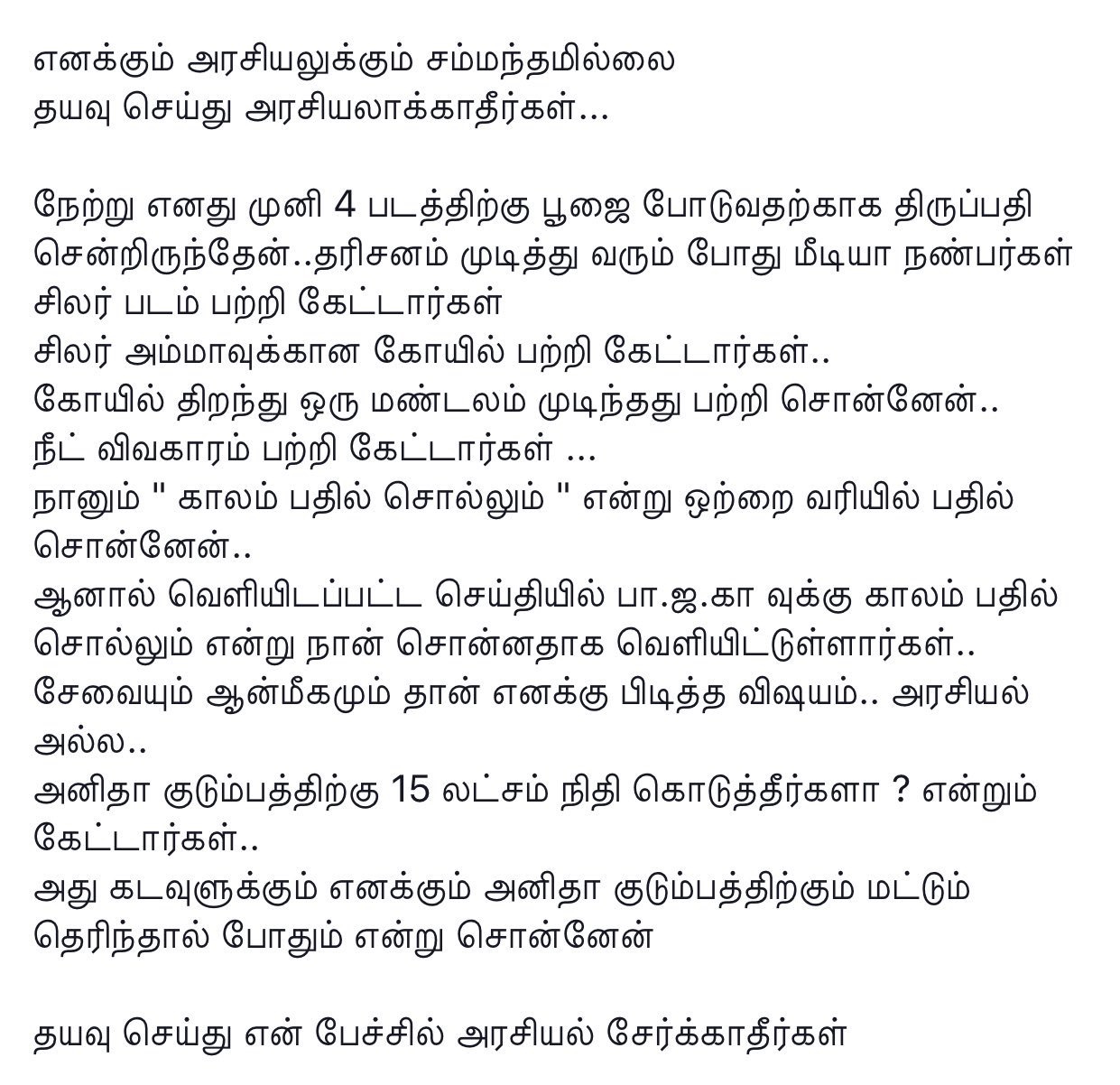 அப்படி இருக்கும் அவரின் நல்ல பெயரை சில மீடியா அவருக்கு அவப்பெயர் பெற்றுத்தர அவரை அரசியல் வலையில் சிக்க வைப்பதற்காக சமிபத்தல் அவர் பற்றிய செய்தி ஒன்றை கிளப்பி விடுவதாக ராகவா தனது வலைதளப்பக்கத்தில் தெரிவித்துள்ளா