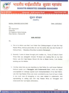 இந்தநிலையில் மும்பையில் இருந்து மறந்த பிரபல தாதா அலி மஸ்தானின் வளர்ப்பு மகன் கொலை மிரட்டல் விடுத்துள்ளாராம் அது என்வென்றால் ரஜினி, ப.ரஞ்சித்தும் தனது தந்தை வாழ்க்கை வரலாற்றை படம் எடுக்கிறார்கள் அவை நல்ல முறையில் சித்தரிக்க வேண்டும், இல்லையென்றால் பின்விளைவுகள் சந்திக்க நேரிடும் என்று ரஜினினுக்கு மிரட்டல் விடுத்துள்ளாராம்.