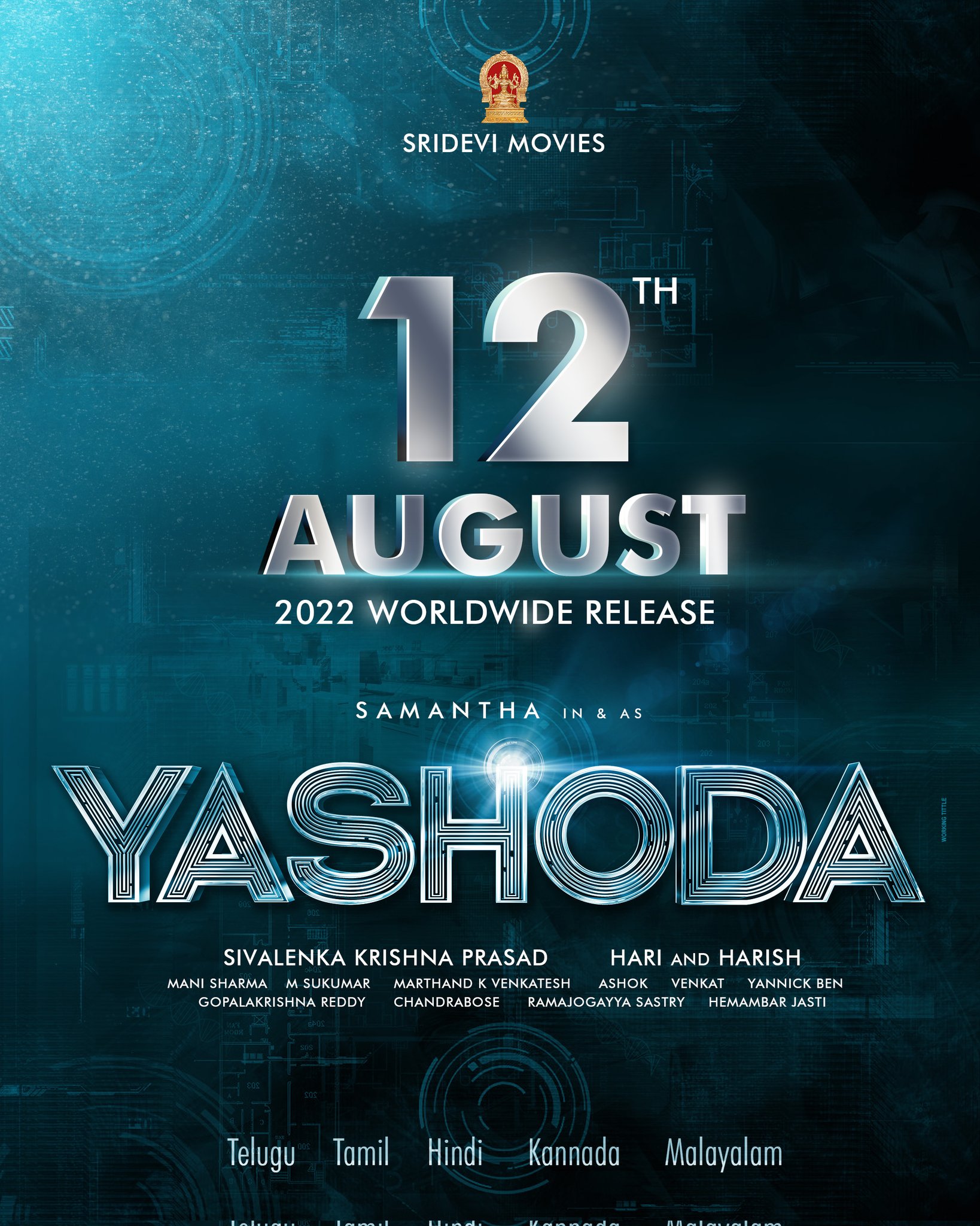 நடிகை சமந்தா முதன்மை பாத்திரத்தில் நடிக்கும் ‘யசோதா’ திரைப்படத்தினை Sridevi Movies சார்பில் சிவலெங்கா கிருஷ்ண பிரசாத் தயாரிக்கிறார். ஹரி-ஹரீஷ் கூட்டணி இப்படத்தில் இயக்குநர்களாக அறிமுகமாகிறார்கள். இப்படம் வரும் ஆகஸ்ட் 12 உலகமுழுதும் பிரமாண்டமாக வெளியாகிறது.