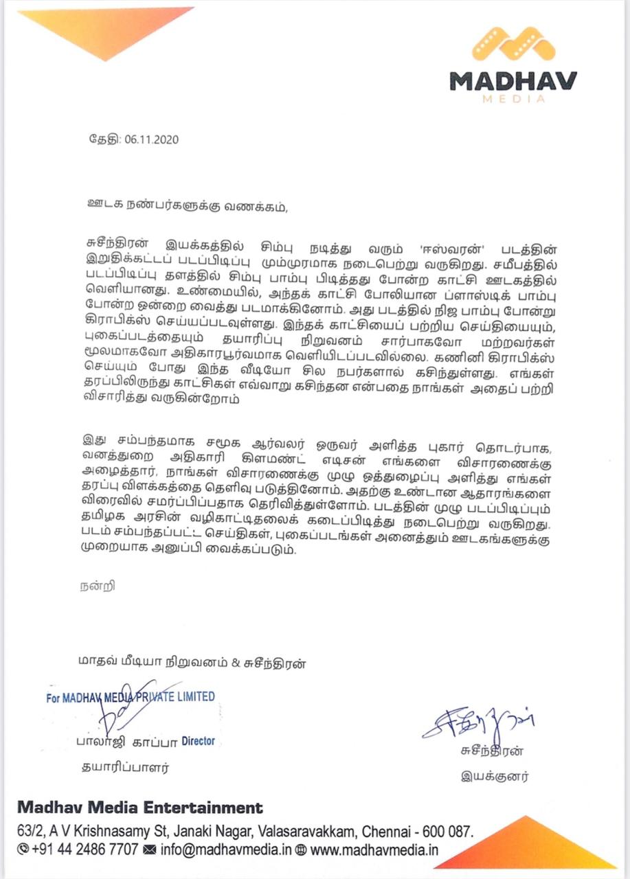 சுசீந்திரன் இயக்கத்தில் சிம்பு நடித்து வரும் ‘ஈஸ்வரன்’ படத்தின் இறுதிக்கட்டப் படப்பிடிப்பு மும்முரமாக நடைபெற்று வருகிறது. சமீபத்தில் படப்பிடிப்பு தளத்தில் சிம்பு பாம்பு பிடித்தது போன்ற காட்சி ஊடகத்தில் வெளியானது. உண்மையில், அந்தக் காட்சி போலியான ப்ளாஸ்டிக் பாம்பு போன்ற ஒன்றை வைத்து படமாக்கினோம். அது படத்தில் நிஜ பாம்பு போன்று கிராபிக்ஸ் செய்யப்படவுள்ளது.