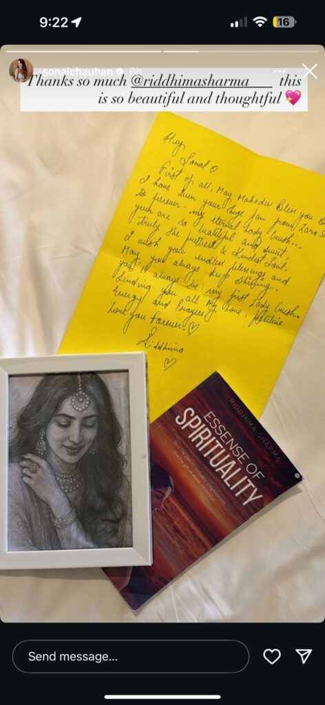 Sonal Chauhan is currently in Chandigarh, shooting for ‘Shera’, an intense family action drama that marks her first Punjabi film. During one of the shoot days, the Jannat actress met a fan around the premises, who turned out to be someone who had been waiting to meet her since the iconic film, Jannat. Sonal Chauhan engaged in a heartfelt talk with the fan, who then revealed that Sonal has been her “girl crush” since Jannat days. After the fan fulfilled her desire to meet Sonal, she even expressed her admiration by gifting a hand-made sketch and a hand written note to the actress.
