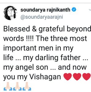 வாழ்த்திய அனைவருக்கும் நன்றி சொன்ன சௌந்தர்யா ரஜினிகாந்த்