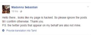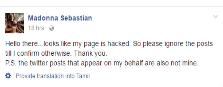 உண்மையில் சுசித்ராதான் ட்வீட் போட்டாரா அல்லது அவர் ட்விட்டர் கணக்கு ஹேக் செய்யப்பட்டதா என்பது இன்னும் கண்டுபிடிக்கப்படவில்லை. இந்நிலையில் நடிகை மடோனா செபாஸ்டியன் தனது ட்விட்டர் கணக்கு ஹேக் செய்யப்பட்டு விட்டதாக ஃபேஸ்புக்கில் தெரிவித்துள்ளார். இது திரையுலகில் அதிர்ச்சியை ஏற்படுத்தியுள்ளது.
