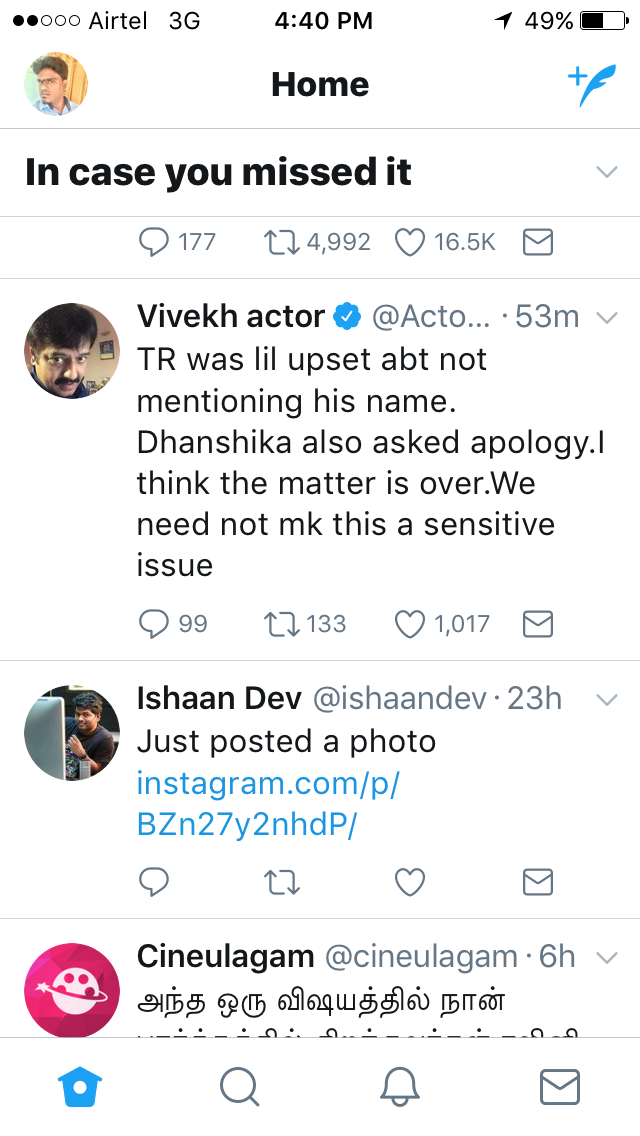 இந்நிலையில் நடிகர் விவேக் டி ஆர்க்கு ஆதரவாக ஒரு கருத்தை தனது டிவிட்டர் பக்கத்தில் போட்டுள்ளார்