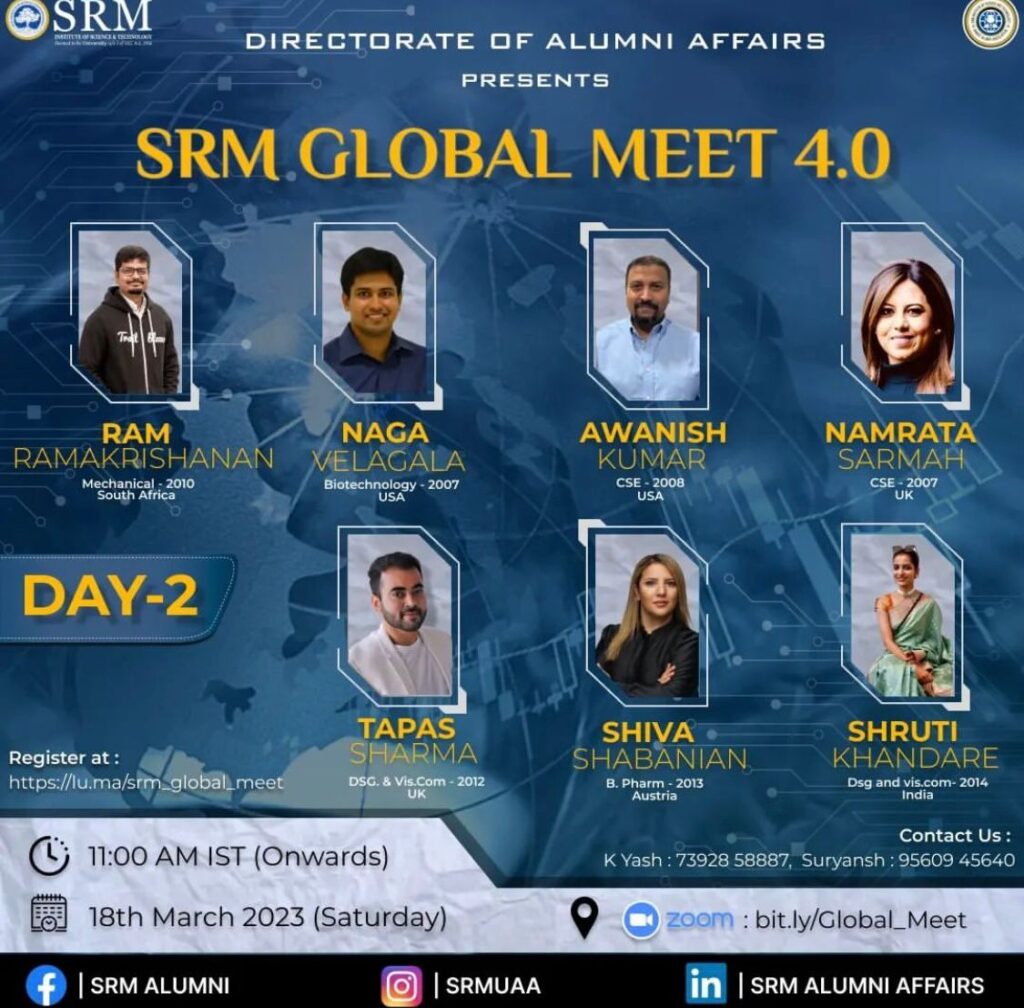March, 2023: The Directorate of Alumni Affairs, SRMIST, presented its flagship event, the SRM Global Meet 4.0, brought together the most accomplished and talented alumni on a global scale. The event had been scheduled on March 17-18, 2023 where March 17 was an offline event specific to the SRM University and March 18 was conducted over Zoom.