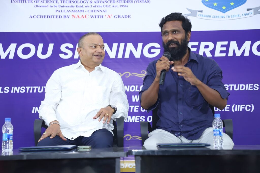 இந்நிகழ்வின் செய்தியாளர் சந்திப்பின்போது, அவர்களின் கேள்விகளுக்கு பதிலளிக்கும் போது கூறியதாவது,”நாங்கள் நடத்தும் பன்னாட்டு திரைப் பண்பாட்டு மையத்தில் மாணவர்களுக்கு கல்வியும் உணவும் இலவசமாக வழங்கப்படுகிறது. பொதுவாக நான் அந்த வார்த்தையை பயன்படுத்துவதில்லை. ஆனால் எங்களுடன் வேல்ஸ் பல்கலைக்கழகமும் இணைந்து பயனிக்க வேண்டும் என்று விரும்பினோம். ஒரே ஒரு அலைபேசி அழைப்பில் ஐசரி.கே.கணேஷ் இந்த ஒப்பந்தத்திற்கு ஒப்புதல் அளித்தார். சமூக, பொருளாதார அடிப்படையில் பின்தங்கிய மாணவர்களுக்கே முக்கியத்துவம் அளித்து தேர்ந்தெடுக்கிறோம். அதிலும் குறிப்பாக முதல் தலைமுறை பட்டதாரிகளுக்கு முன்னுரிமை அளிக்கிறோம். எங்களது நிறுவனம் அல்லாத பொதுவான மாணவர்களுக்கும் வாய்ப்பு உண்டு.