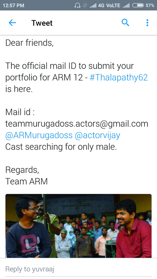 தமிழ் சினிமாவில் மிகப்பெரிய ரசிகர் பட்டாளத்தை கொண்டவர் இளைய தளபதி விஜய்.இவருக்கு பலமே இவரது ரசிகர்கள் தான்.இவரை ஒருபோதும் ரசிகர்கள் விட்டுகொடுத்தில்லை.இவரது கலைபயணம் தொடங்கி இன்றுடன் 25 வருடம் நிறைவடைகிறது.இவரது கலைபயணத்தை சிறப்பிக்கும் விதமாக டிவிட்டரில் இன்று ஸ்பேஷல் டேக் செய்து உலகளவில் டிரெண்ட் செய்ய முடிவெடுத்துள்ளனர்.இந்நிலையில் தளபதி விஜயுடன் “தளபதி62” படத்தில் நடிப்பதற்காக அழைப்பு விடுத்துள்ளனர்.தங்கள் புகைப்படம் அனுப்பவேண்டிய மின்னஞ்சல் teammurugadoss.actors@gmail.com.
