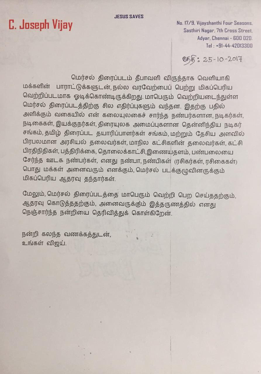 இதற்கு தளபதி விஜய் ரசிகர்களுக்கும் அவருக்கு அதரவாக நின்ற அனைவருக்கும் நன்றி சொல்லியுள்ளார். இந்த அரசியல்வாதிகளால் விஜய்யாக இருந்த விஜய் தற்போது ஜோஸப் விஜய் என்று பெயர் மாற்றியுள்ளார் என்று தான் சொல்லணும் காரணம் இதற்கு முன் அவரின் கடிதங்களில் வரும் லெட்டர் பேட்யில் வெறும் விஜய் என்று தான் இருக்கும் இப்போது ஜோசப் விஜய் என்றும் ஜீசஸ் சேவேஸ் என்ற வாசகமும் உள்ளது.