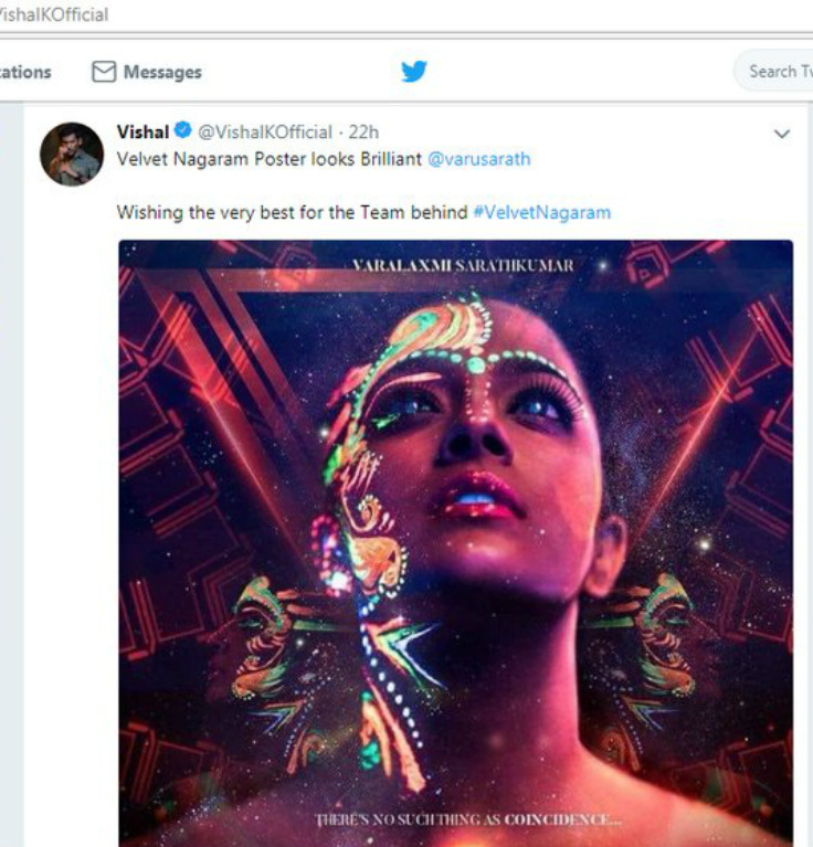 வெல்வெட் நகரம் போஸ்டர் சூப்பராக உள்ளது என்று கூறி ட்வீட்டியுள்ளார் விஷால். மேலும் படக்குழுவுக்கு வாழ்த்தும் தெரிவித்துள்ளார். விஷால் வாழ்த்தி ட்வீட்டியதை பார்த்த வரலட்சுமி மகிழ்ச்சி அடைந்து அவருக்கு நன்றி தெரிவித்துள்ளார்.