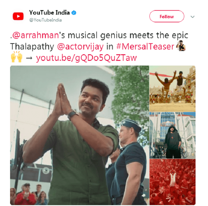 விஜய் ரசிகர்கள் தான் சொன்னதை செய்பவர்கள் என்று விஜய்க்கு உணர்த்தியவர்கள் ஆம் மெர்சல் சாதனை மிக பெரிய ளவில் இருக்கும் என்று சபதம் எடுத்து மெர்சல் இசை முதல் பார்வை போஸ்டர் மற்றும் டீசர் இவை அனைத்தும் இன்று ஒரு சரித்திர சாதனை என்று தான் சொல்லணும். இதனால் ட்விட்டர் விஜய் மெர்சல் படத்துக்கு கொடுத்த கெளரவம் நாம் அறிவோம் இப்ப யு டுப் கொடுத்த கெளரவம் என்ன தெரியுமா.
